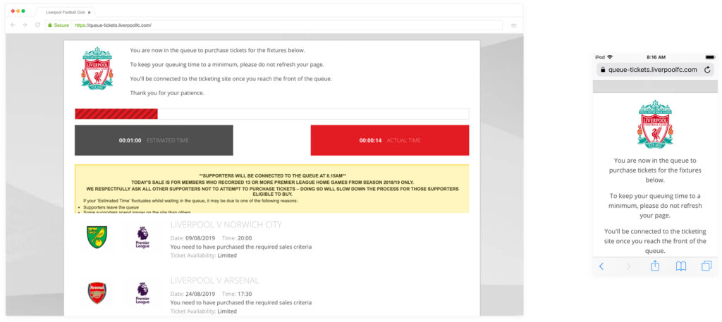 When the page reopens, a certain amount of users will be connected to the ticket site straight away, while the rest will be placed in a queue. The queue page informs users of their wait so far, and their estimated wait time remaining.